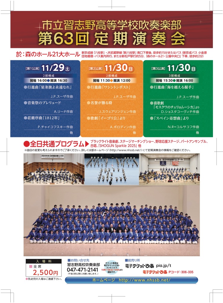 演奏会に関しての問い合わせ 習志野高校吹奏楽部 047-471-2141(午後3時以降にお願いします。)